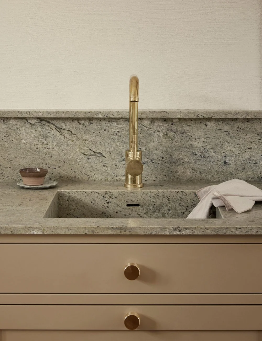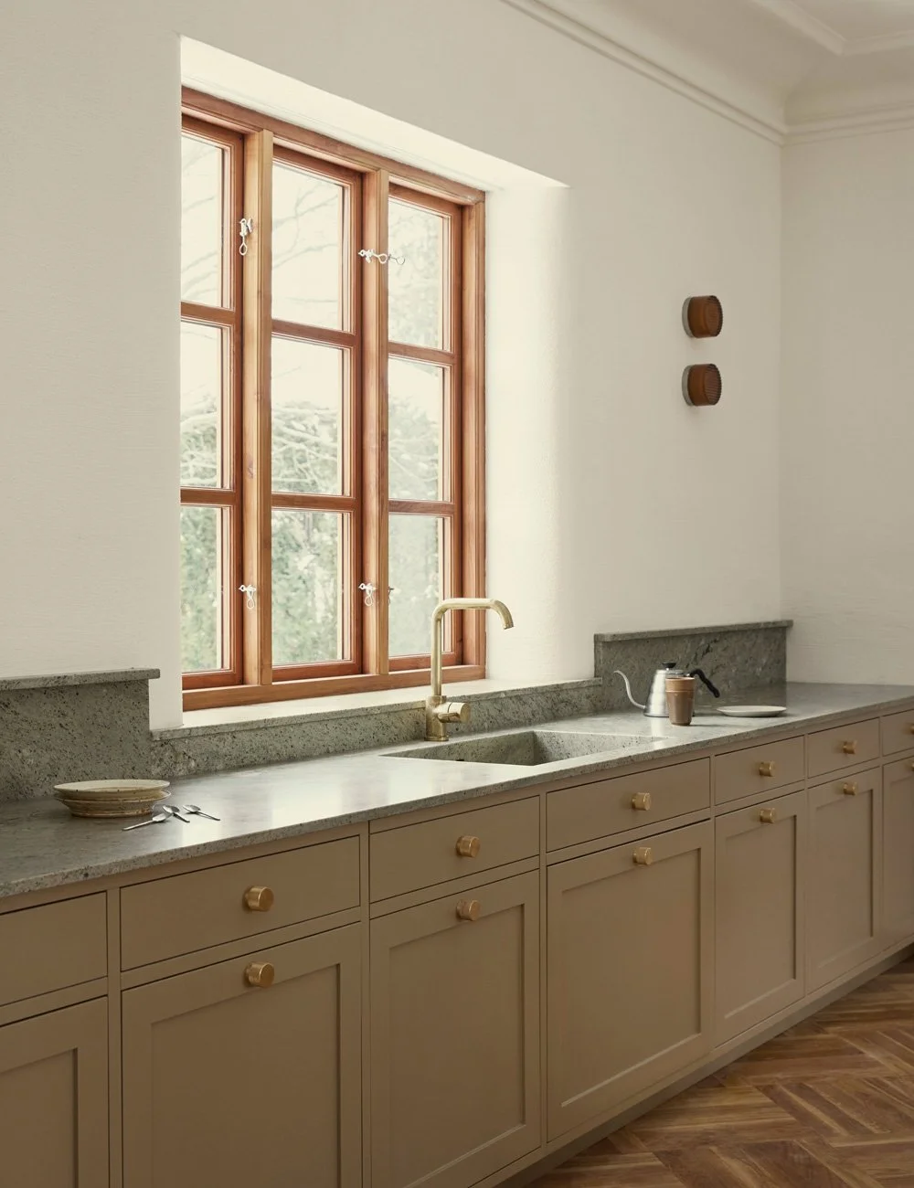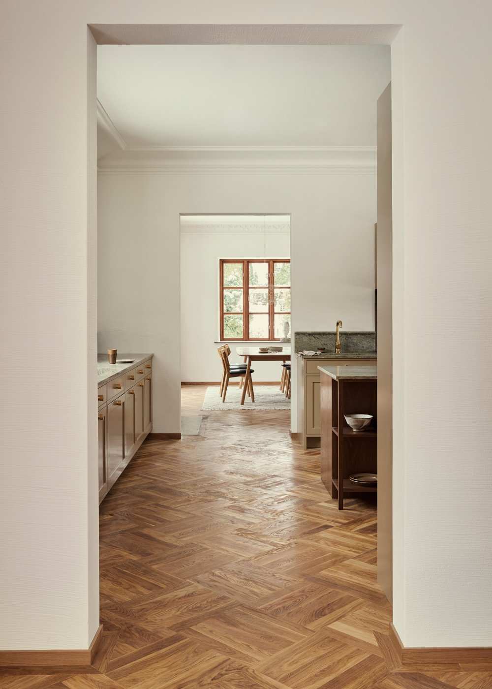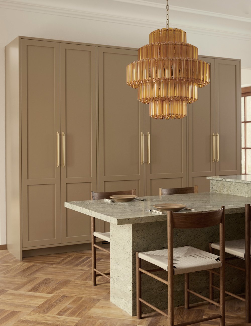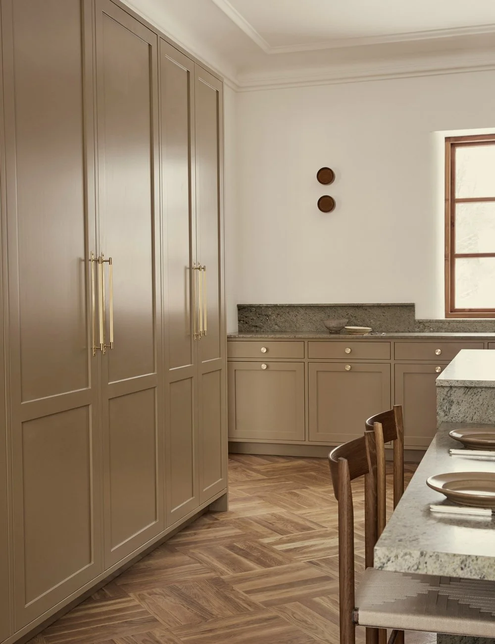 The Shaker cabinetry is painted in Nordiska Kök’s colour Desert Clay, a muted beige tone that is both timeless and gives the kitchen a refined, calm expression.