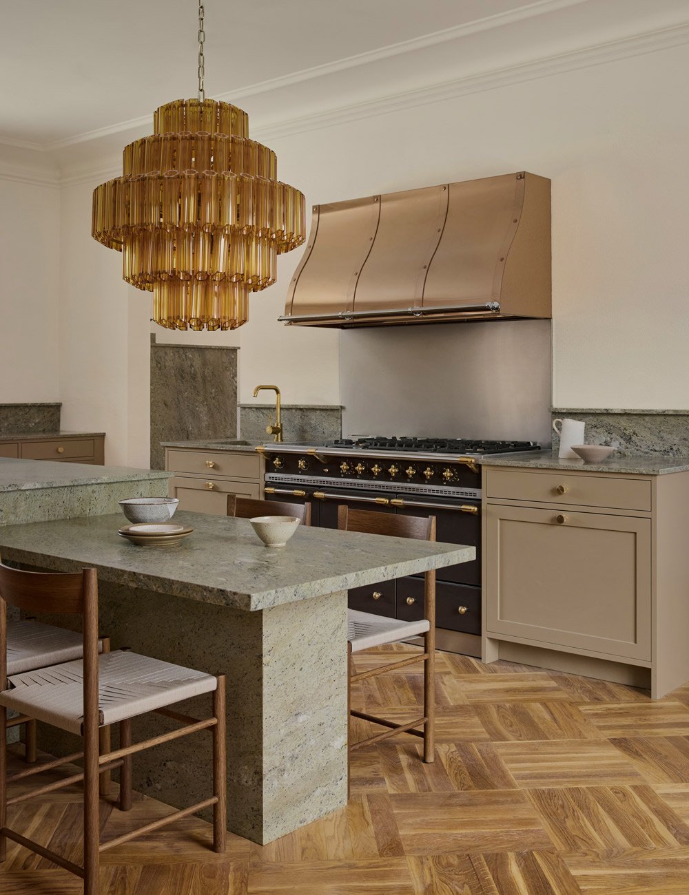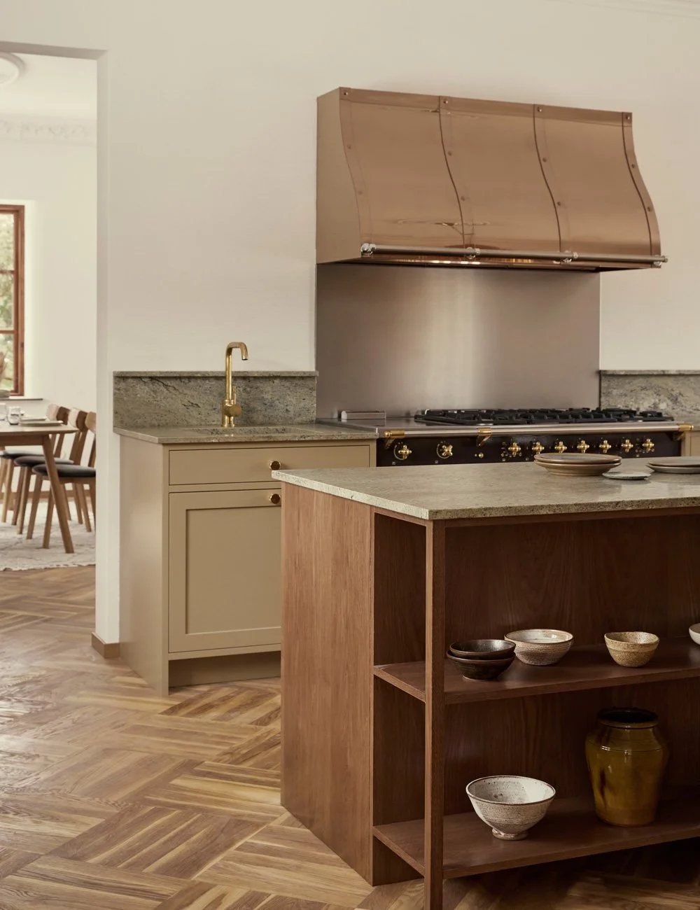 The statement copper range hood from Fjäråskupan is both functional and sculptural, serving as an elegant focal point in the heritage kitchen. The warm metallic finish pairs beautifully with the clay-toned cabinetry and the dark oak kitchen island.