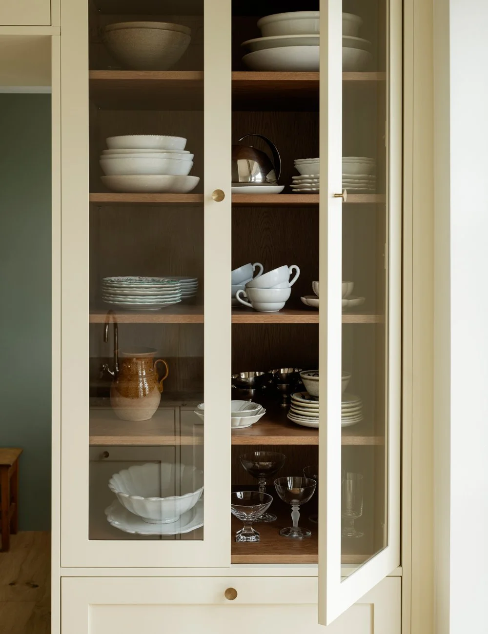 A Shaker display cabinet with wooden shelves, holds vintage finds and ceramics, and add character and soul to the space.