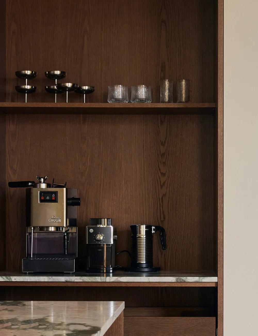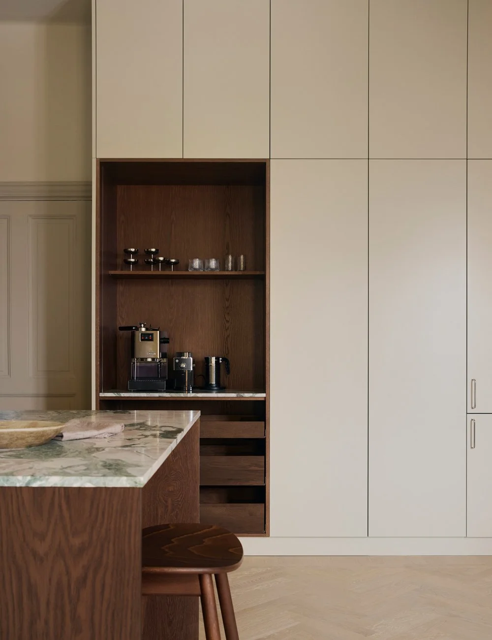 The open cabinet in dark oak provides space for both a coffee station and storage, becoming a beautiful and functional element of the kitchen’s design.