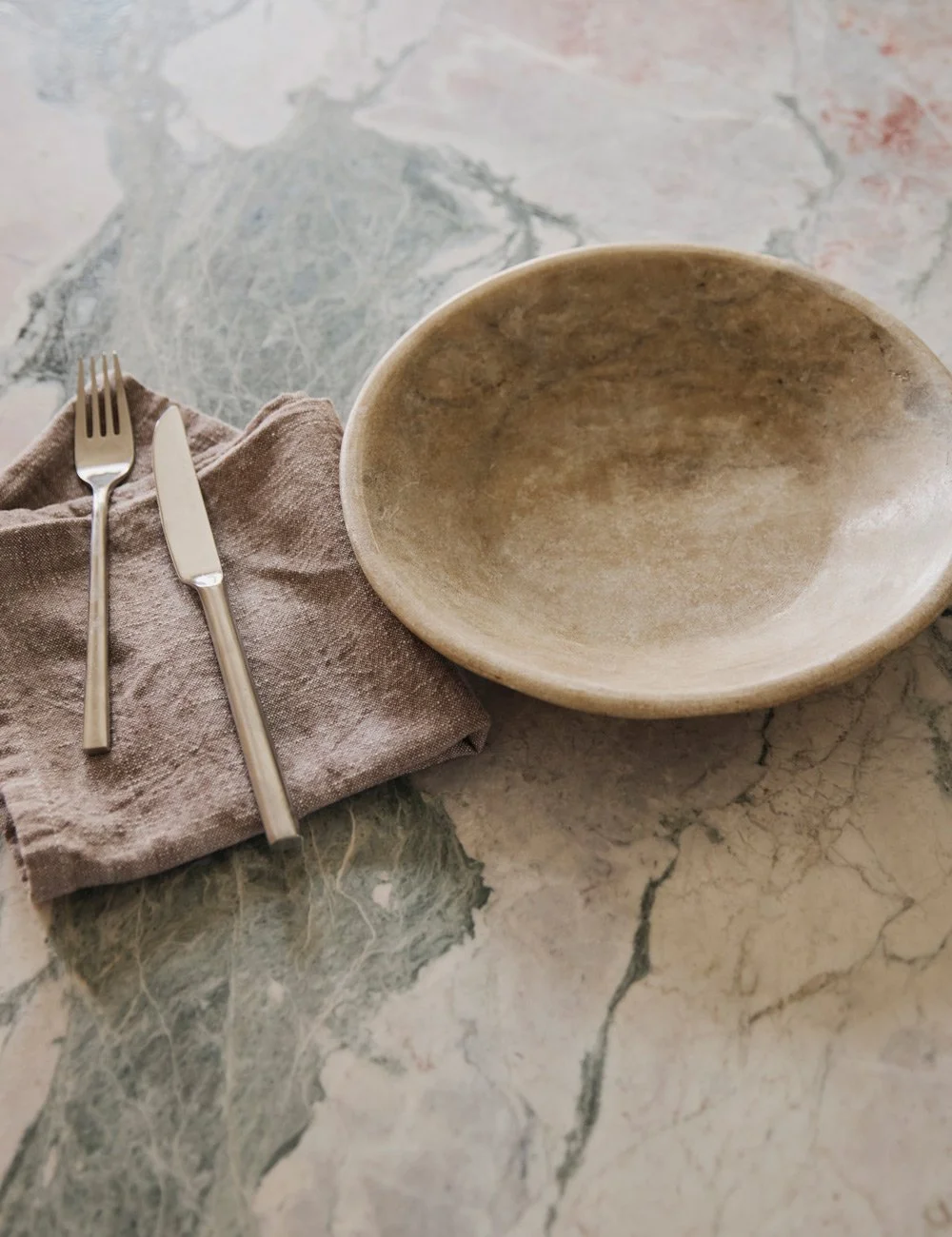 The vibrant marble worktop ‘Four Seasons’, adds depth and character to the dark wood kitchen’s minimalist design and restrained palette.