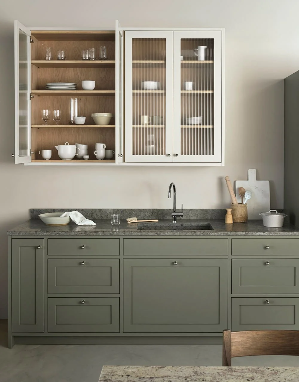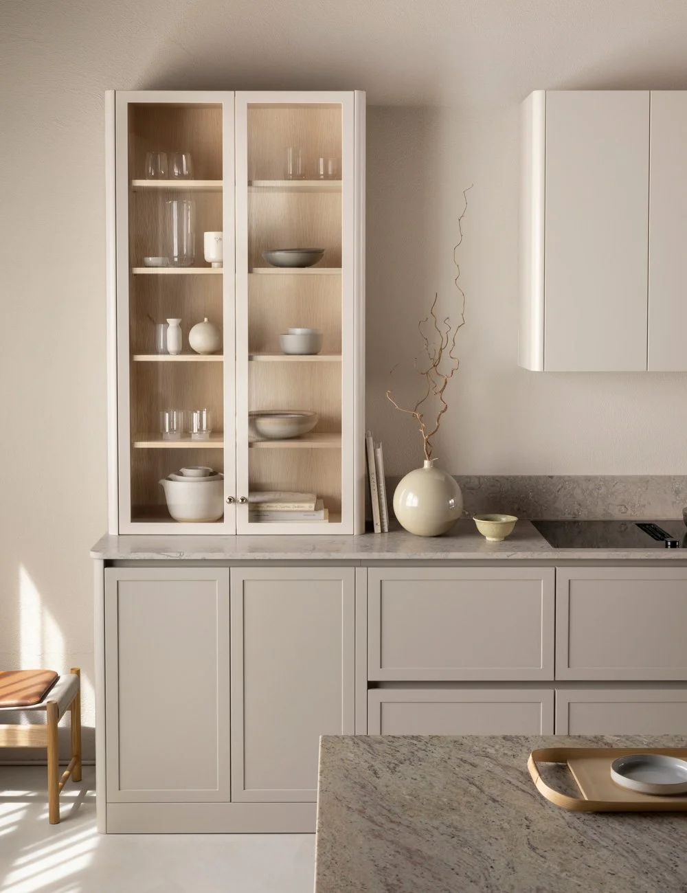 Contemporary beige shaker-style kitchen that balances Scandinavian design with classic details and modern functionality.