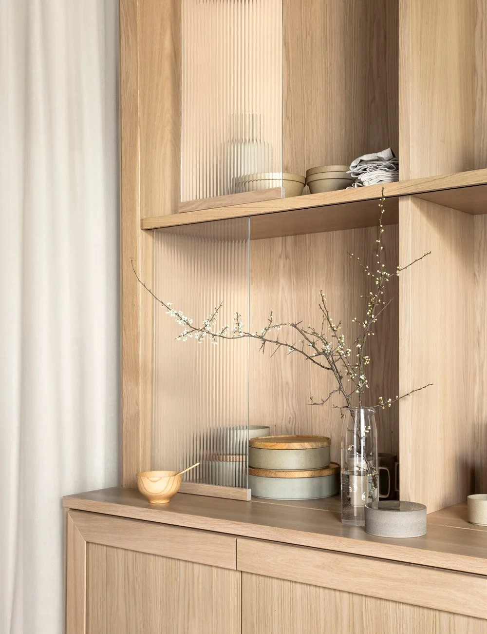 Display cabinet in light oak with elegant fluted glass and drawers in solid oak.