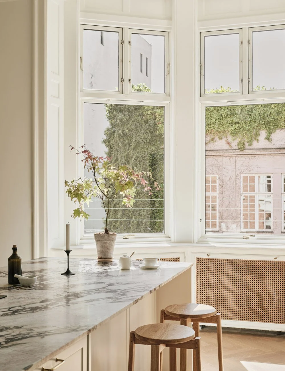 With carefully selected materials and colours, a harmonious whole is created – where historical charm meets modern Scandinavian design. Barstools by Audo Copenhagen.