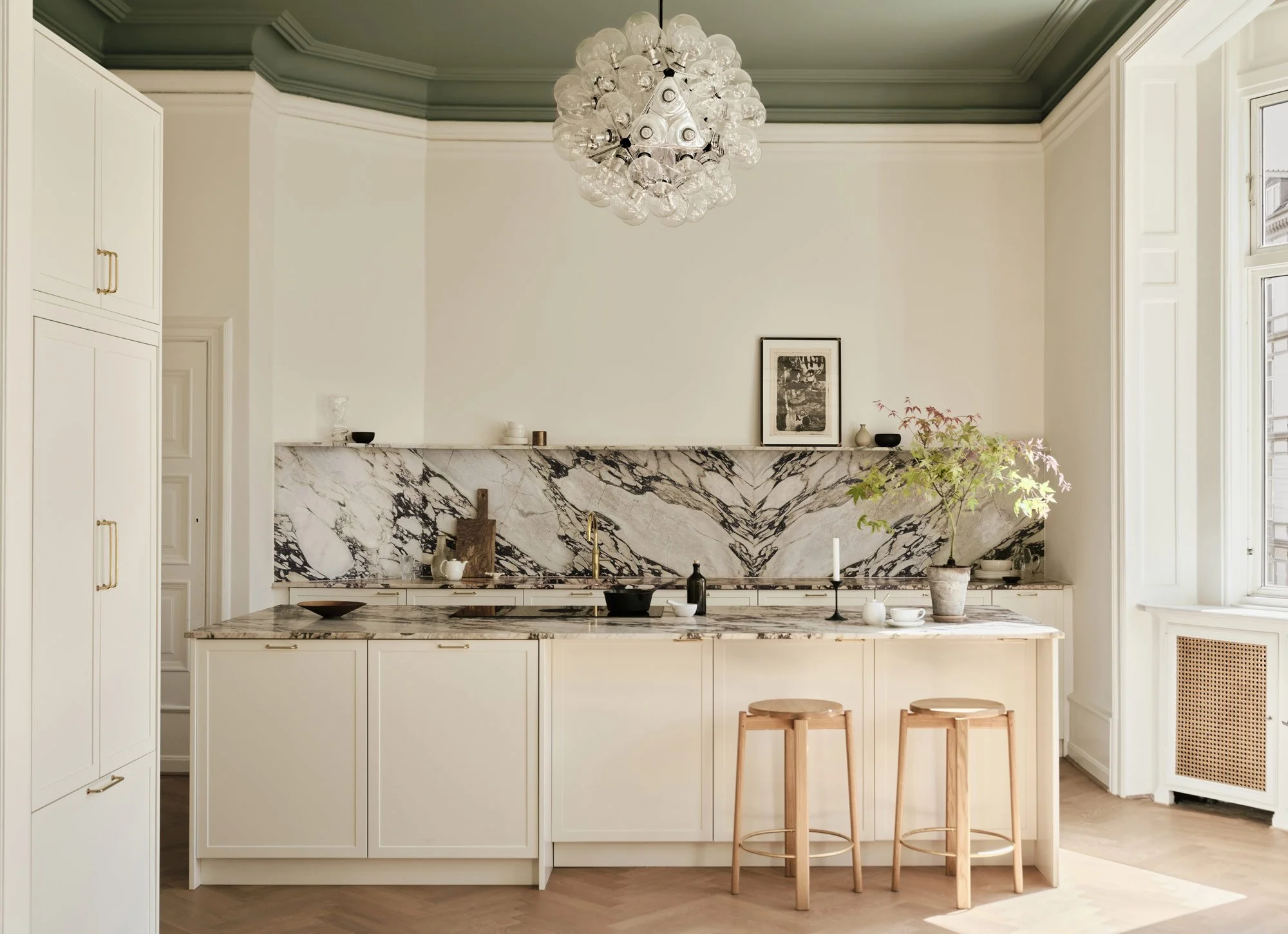 The kitchen exudes Scandinavian minimalism through its light colour palette, beautifully complemented by lively marble and elegant brass details.