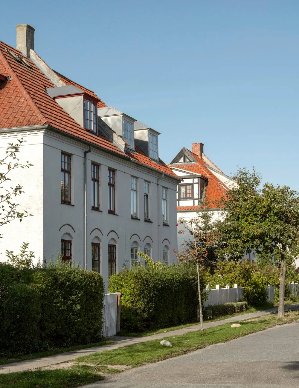 Den Hvide By in Valby, Copenhagen is a distinctive residential area built in the 1890s. The neighbourhood is known for its uniform white semi-detached houses, designed by architect Christian Mandrup-Poulsen, along with its green courtyards and calm, village-like atmosphere — all just minutes from the vibrant centre of Copenhagen.