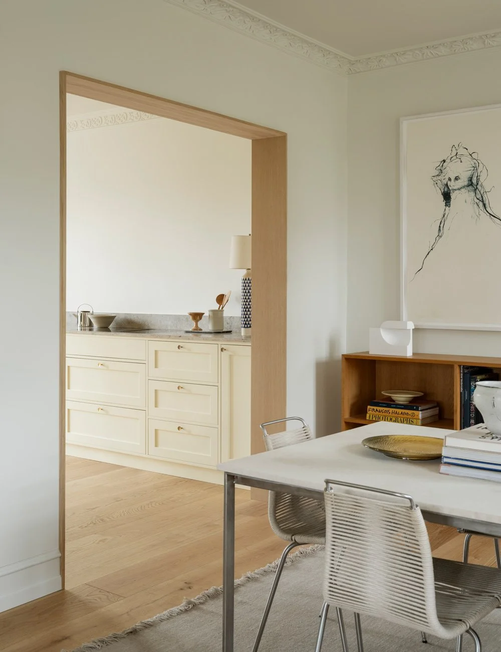 Nestled in the charming district of Den Hvide By in Copenhagen lies the home of Danish interior photographer Line Klein. Newly renovated, the Neo-Baroque residence features a light yellow Shaker-style kitchen by Nordiska Kök, blending the eclectic charm and bohemian aesthetic of Danish style with the timeless, minimalist principles of Scandinavian design.