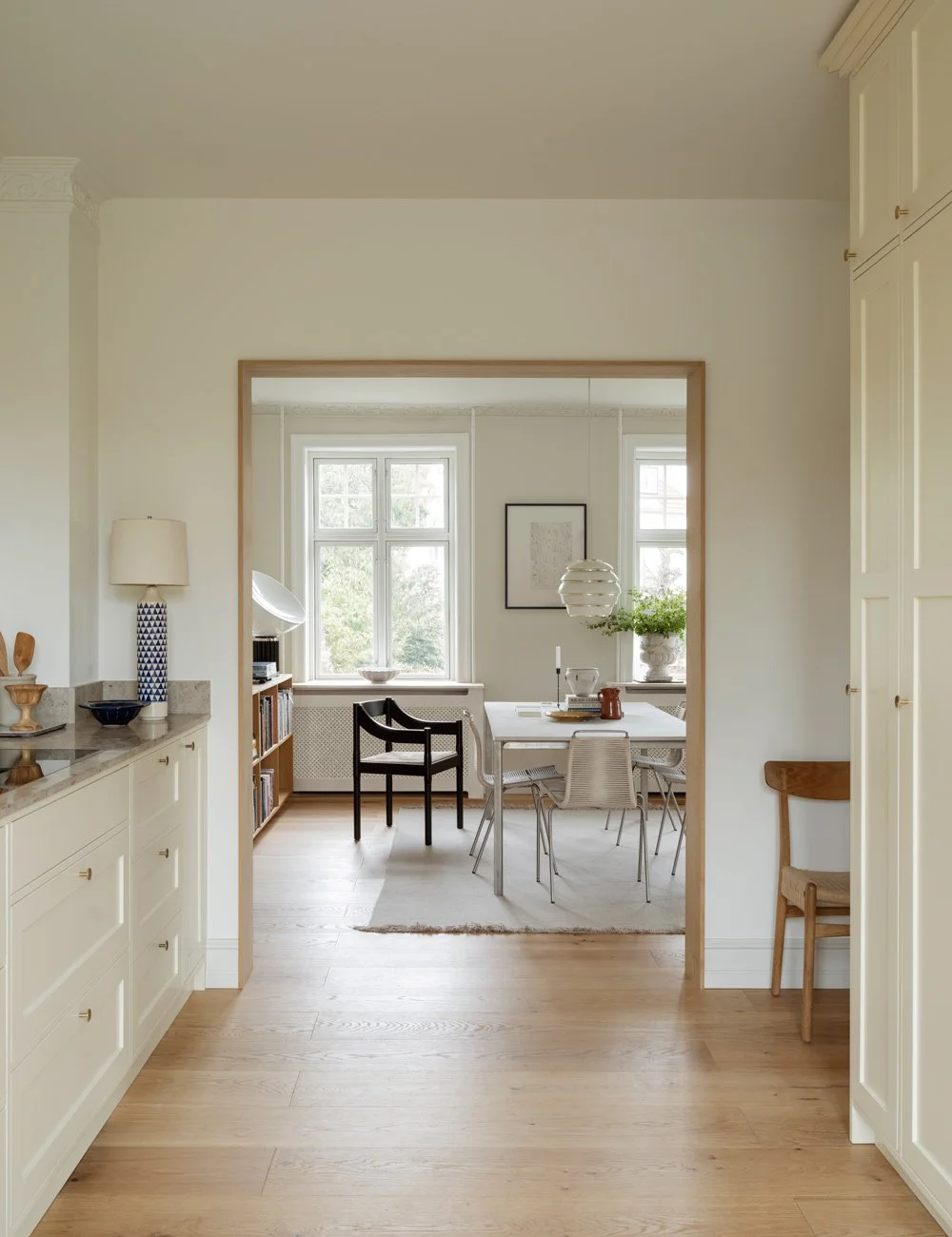 The kitchen and dining area feels airy and open, connected by a wide opening that allows light and life to flow between the spaces. On the wall, art by Danish artist Cathrine Raben Davidsen adds a personal touch. Dining table by FRAMA.
