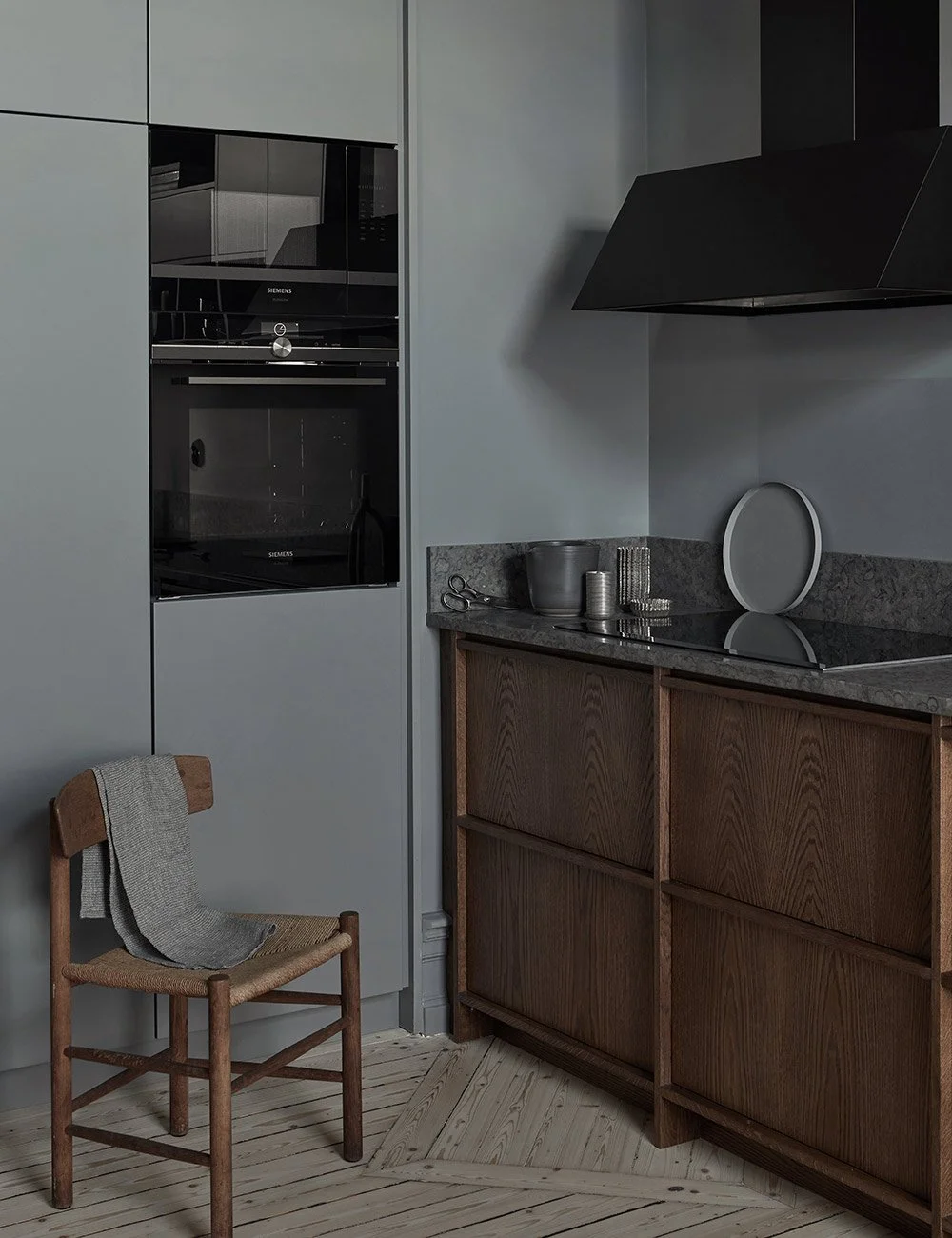 Fridge and freezer have been hidden behind grey lacquered fronts and oven and micro are built in for a minimalist feel. The fan from Fjäråskupan is black to create an industrial feel that creates a perfect contrast against the rustic wooden cabinets.