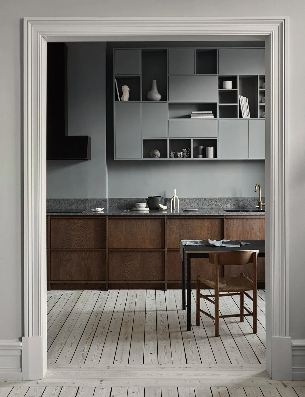 The warm oak creates a soft contrast to the lacquered upper cabinets in grey.