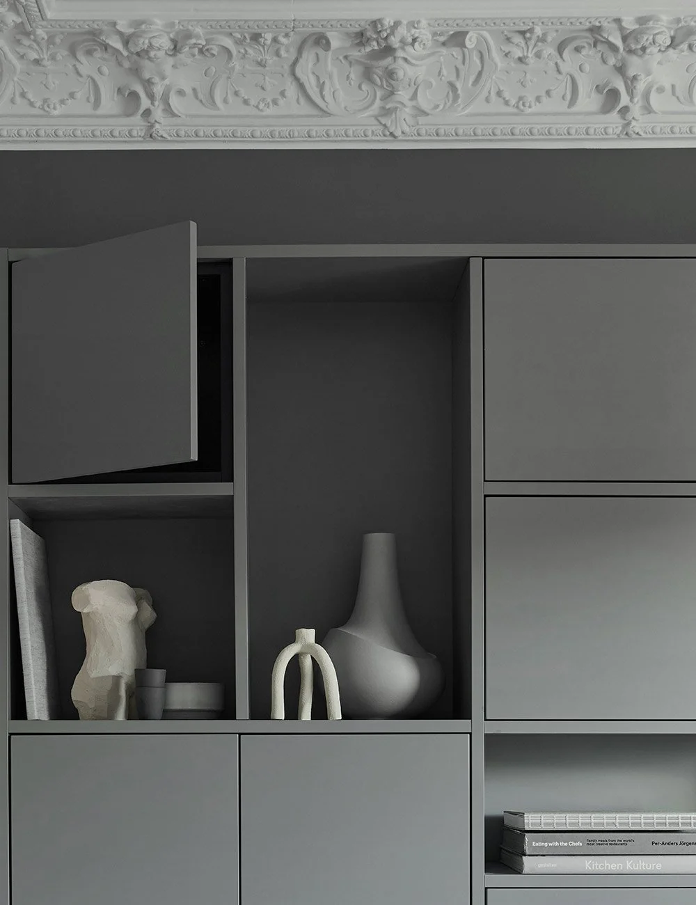 The grey tones of the limestone are matched with beautiful ceramics and details in stainless steel.