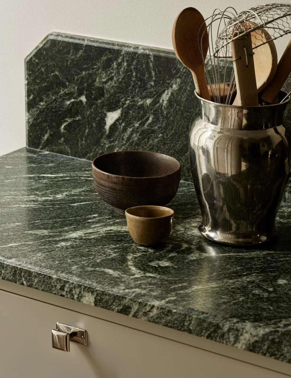 The green granite worktop “Verde Italia” is beautifully paired with greige tones and chrome knobs.
