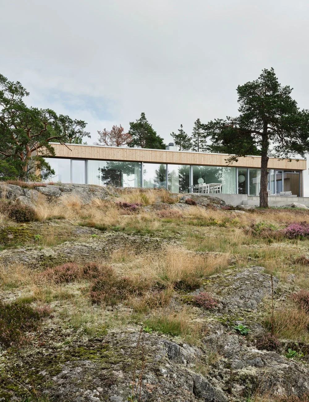 The modern home is set into Värmdö’s raw coastal landscape, with sweeping views and a strong connection to nature.