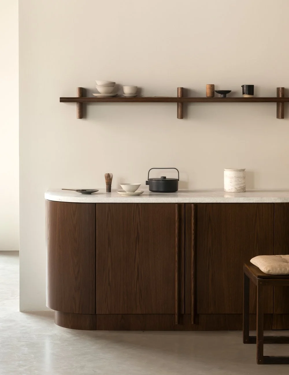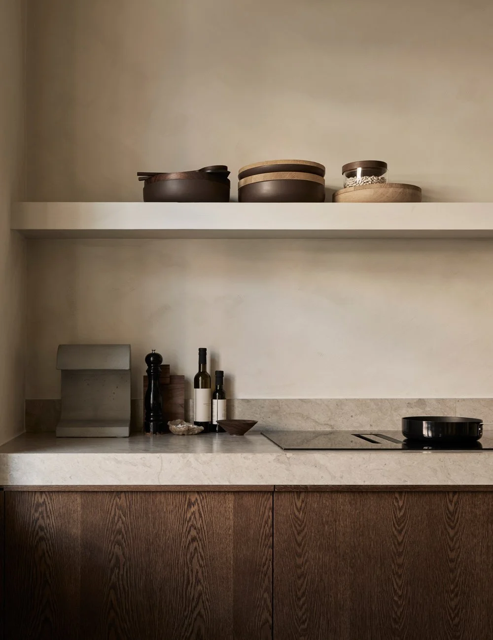 The earthy, nature-inspired essence of Japandi takes on a rawer and more powerful expression, evoking rustic austerity while still preserving Japandi's tactile sense of calm. Stone, dark wood, and textured surfaces meet a warm, earthy colour palette—now with an even stronger emphasis on authenticity, giving the kitchen a distinctive character.