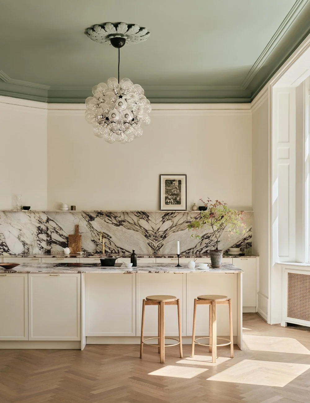 From coloured ceilings to vibrant veined marble, natural materials are enhanced by curated contrasts.