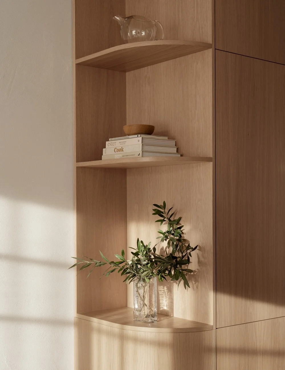 Soft curves balance the kitchen’s clean architectural lines, while oak adds warmth and tactility to the space. Vase by New Works. Glass jug by Orrefors.