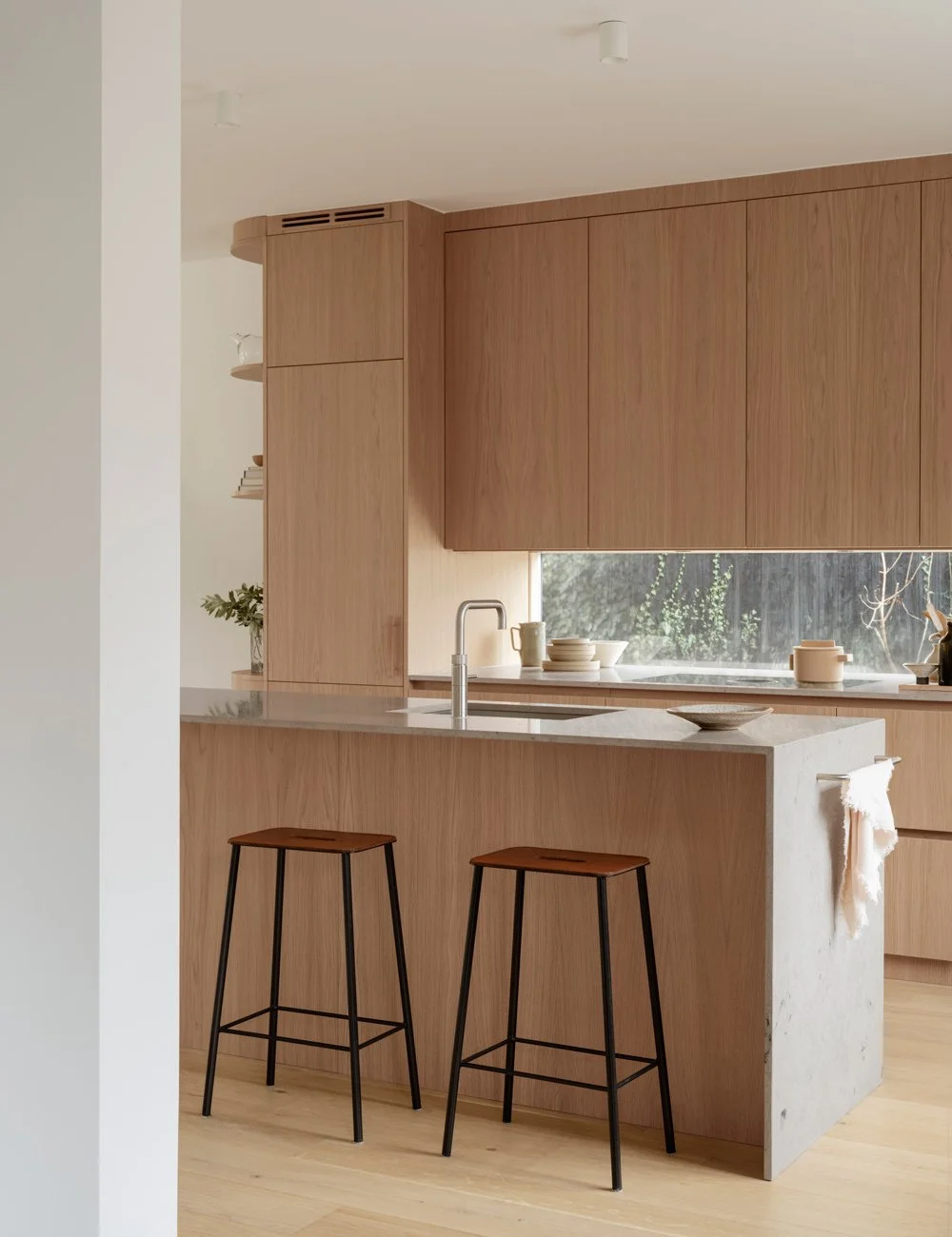 For the kitchen, Lin envisioned a light, calm space connected to the architecture with timeless, enduring materials. Bar stools by Frama.