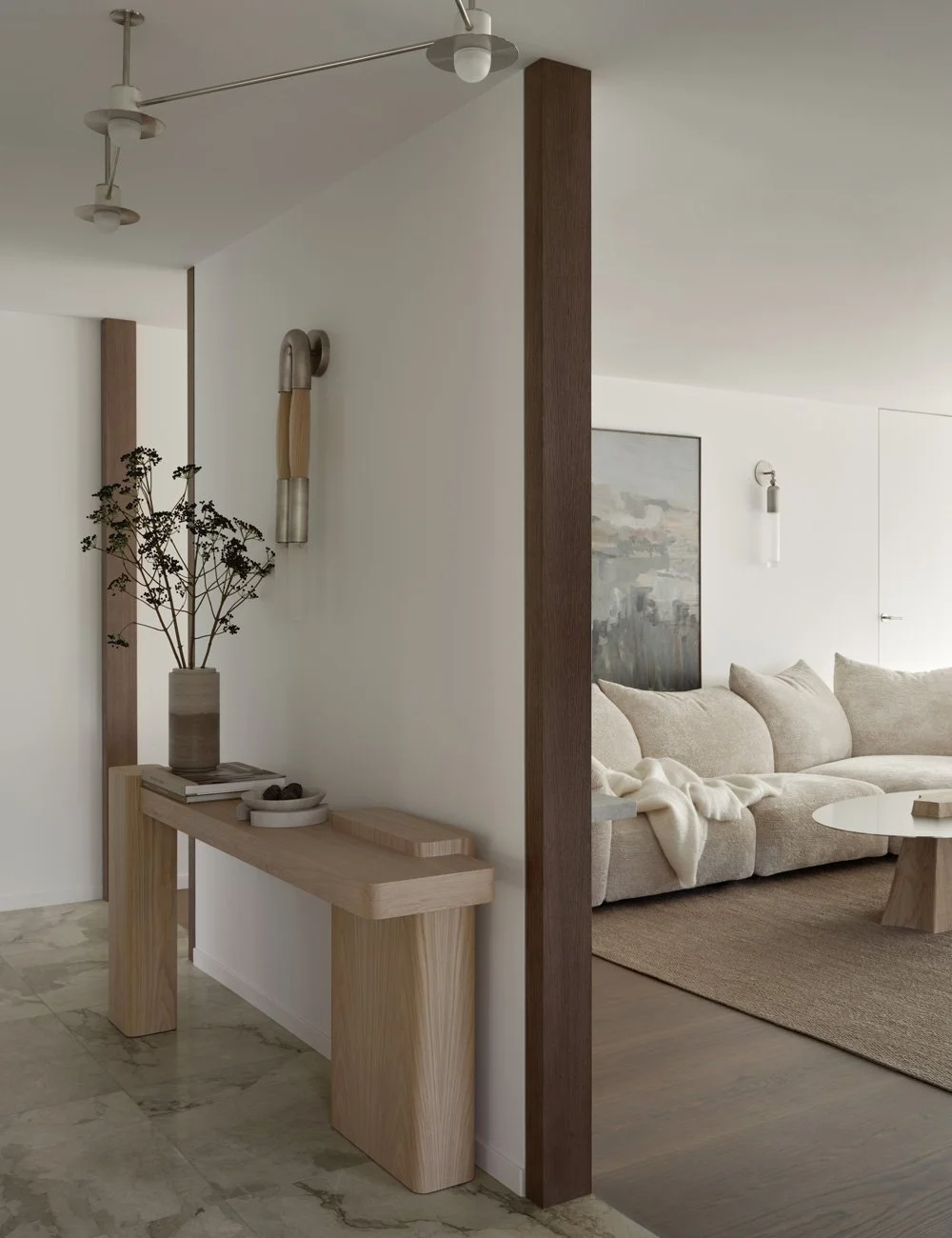 The home is defined by a cohesive flow of tactile materials and calm, natural tones, complemented by soft, sculptural forms that add character without overpowering the space.
