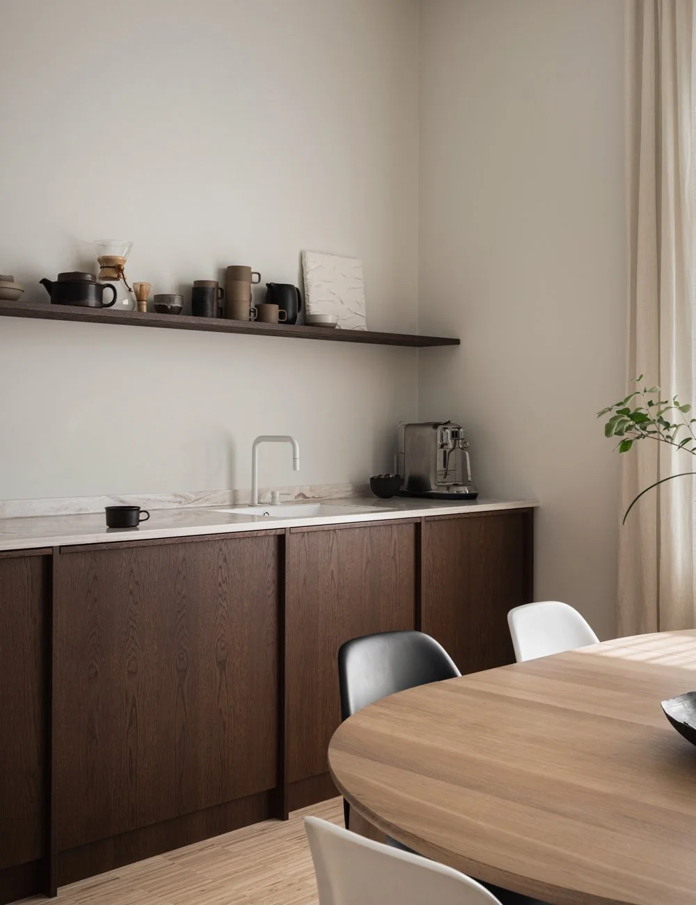 The material palette is understated and earthy, with a mix of wood tones that adds depth, balanced by lighter elements, reflecting the minimalist aesthetic characteristic of Scandinavian design. The dining table ‘Expand’ is by Northern. Chairs is ‘Eames DSR’ by Vitra. Pendant lamp is ‘Semi Pendant’ by Gubi.