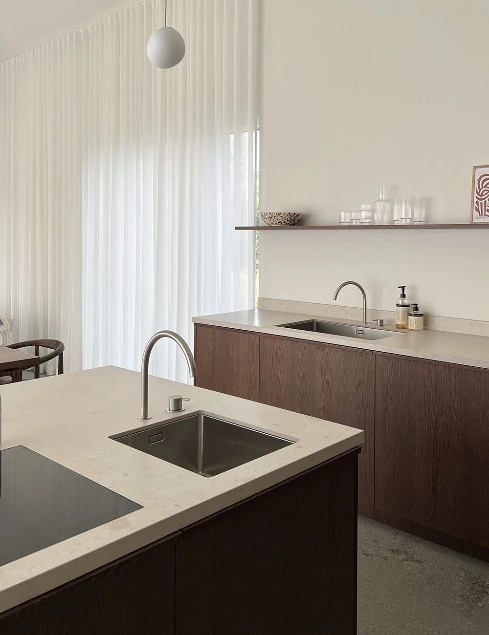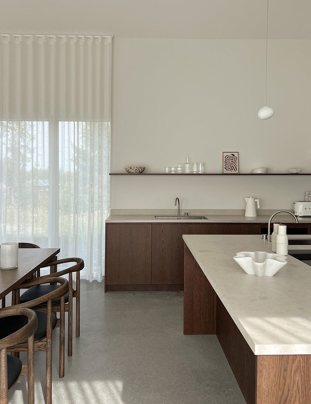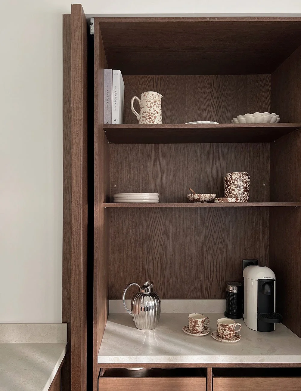 - If I had to choose only one thing in the kitchen that I hold particularly dear, it would have to be the clever pocket door cabinet with our coffee bar inside. It adds a touch of luxury and contributes to the overall ambience of the kitchen. Maximilian loves the kitchen island and how it allows him to cook while being a part of the interactions and conversations happening at the dining table and living room just a few meters away, Emma says.