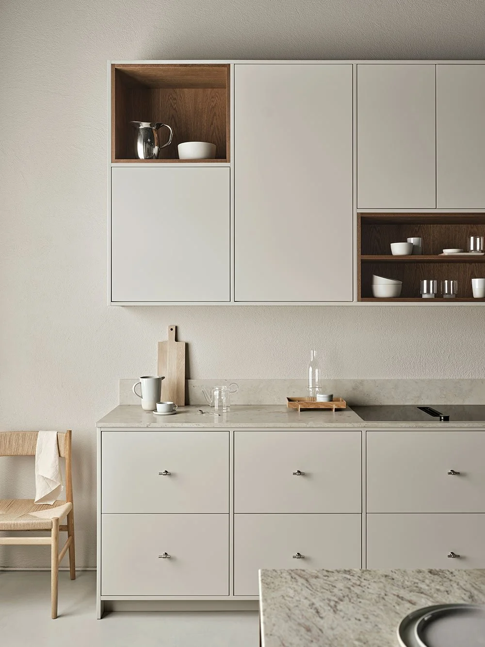 As for the design, today we focus on straight lines and balance. The impression should be calm, clean and elegant. This is achieved by choosing larger cabinet doors, integrating appliances into the cabinetry and hidden drawers. You can also calm down the impression by painting the walls in the same tone as the kitchen, or a slightly lighter or darker version of the same color.