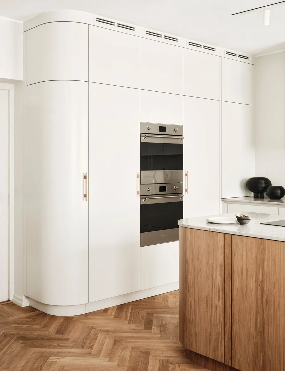 The white kitchen with rounded soft forms is both elegant and functional with built-in appliances.