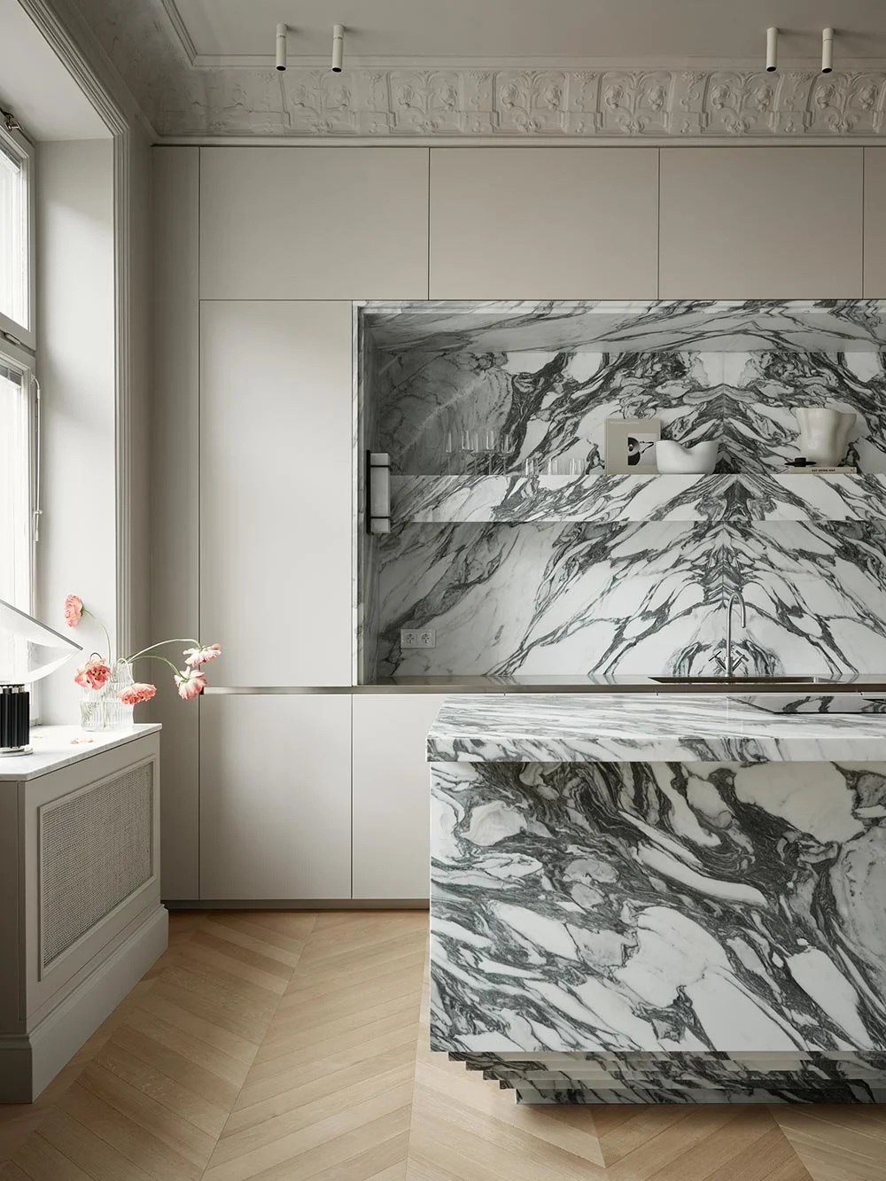 A modern white kitchen with a majestic kitchen island in Arabescato Corchia marble.