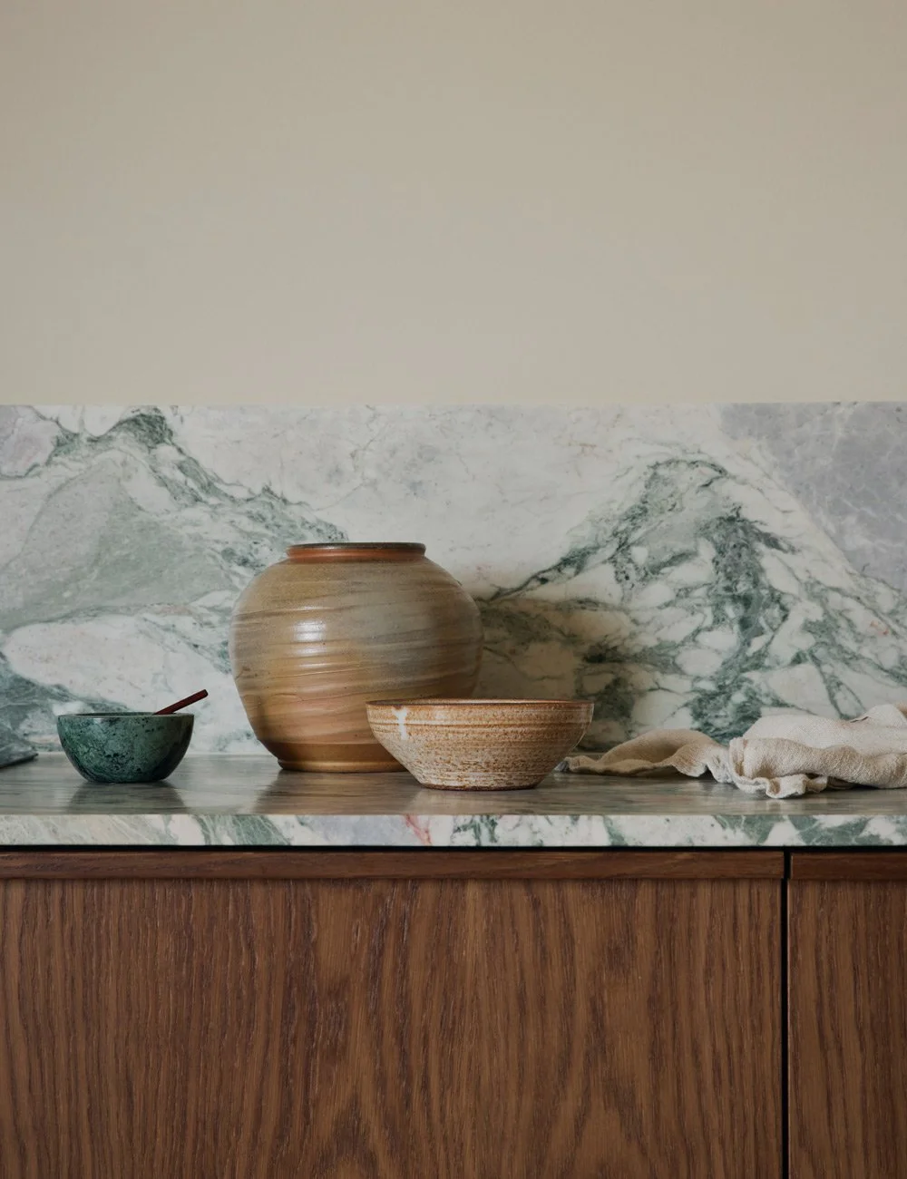 The kitchen’s muted palette strikes a perfect balance between warm and cool, just like the rest of the home. Big ceramic vase from Bonnibonne.