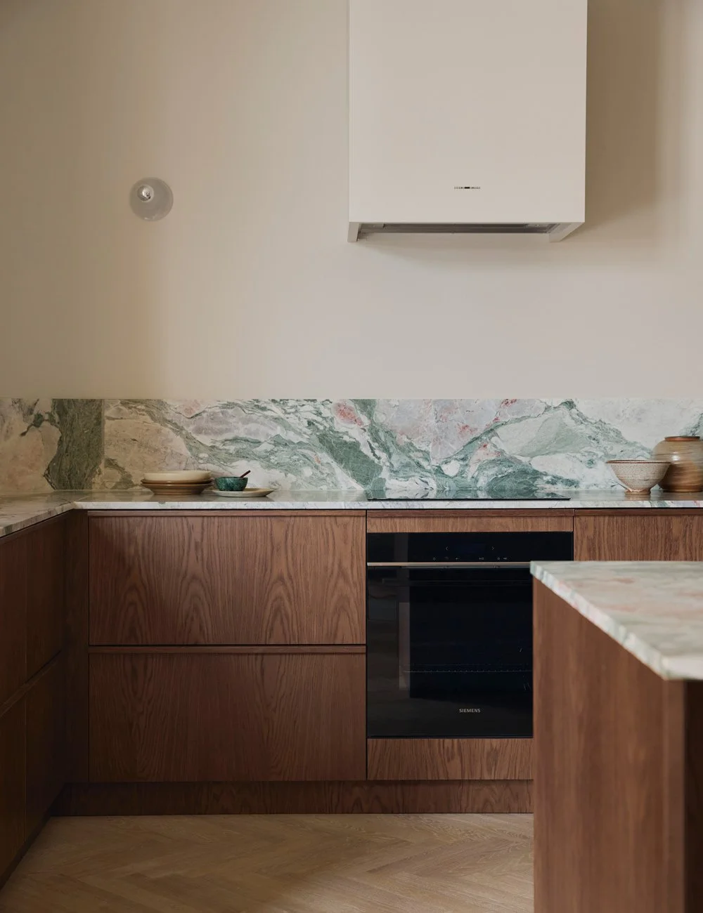 The kitchen’s design is minimalist, yet softened by carefully chosen natural materials. Base cabinets in dark oak are paired with painted tall units, while an expressive marble worktop introduces tones of white, blue, pink and green.