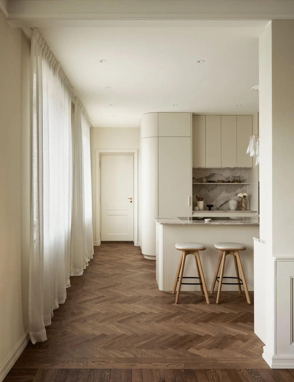A beige, minimalist kitchen where Scandinavian design meets French elegance, with bespoke details that add a modern feel to the space.