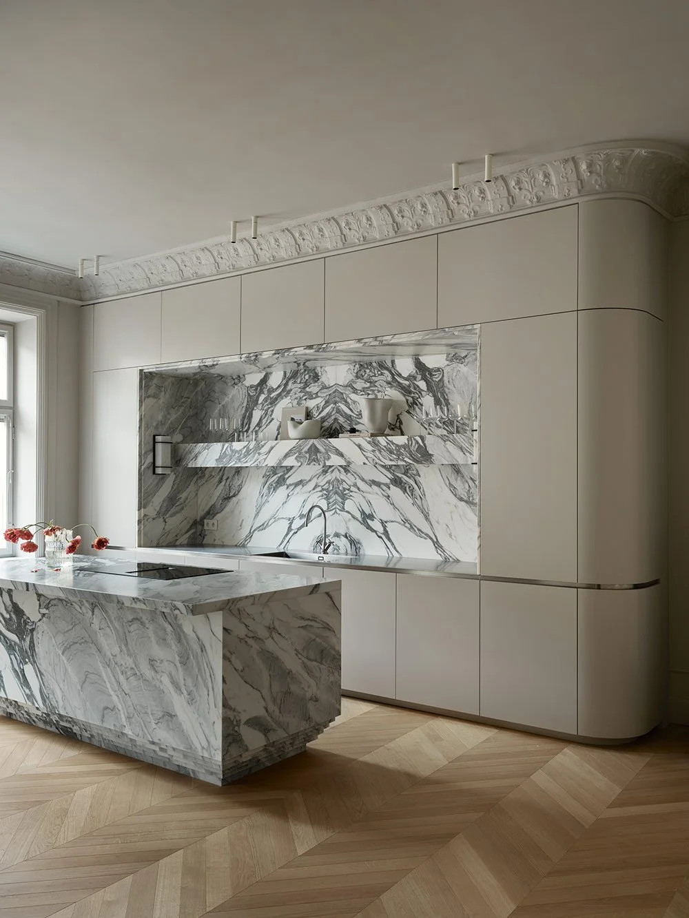Minimalist kitchen design with hidden grip and beautiful limestone in the Oscar Properties' project "Katarina västra skola" on Södermalm in Stockholm.