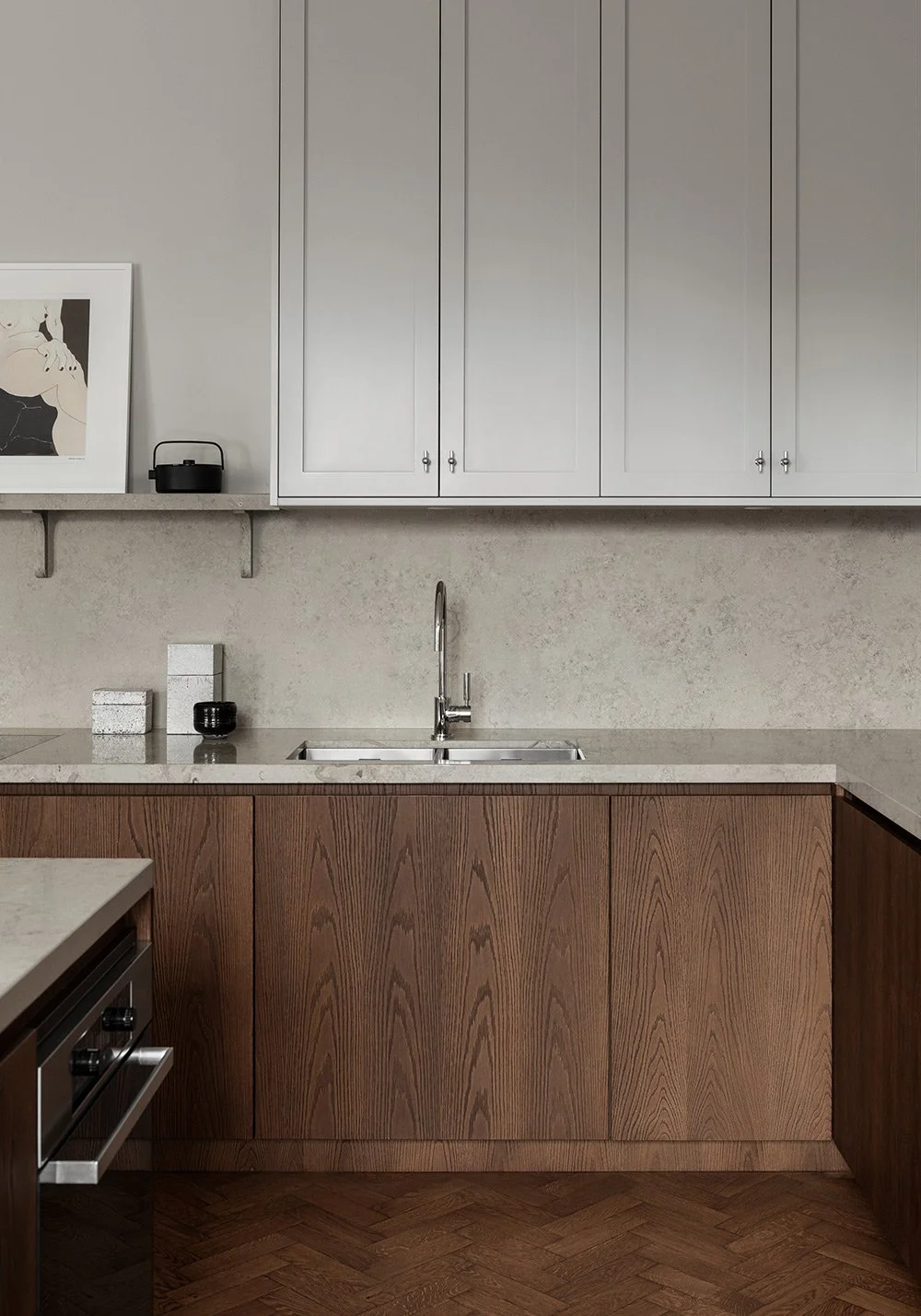 A beige modern Shaker kitchen that blends timeless craftsmanship with contemporary design, in the 1905 apartment in Gothenburg, Sweden.