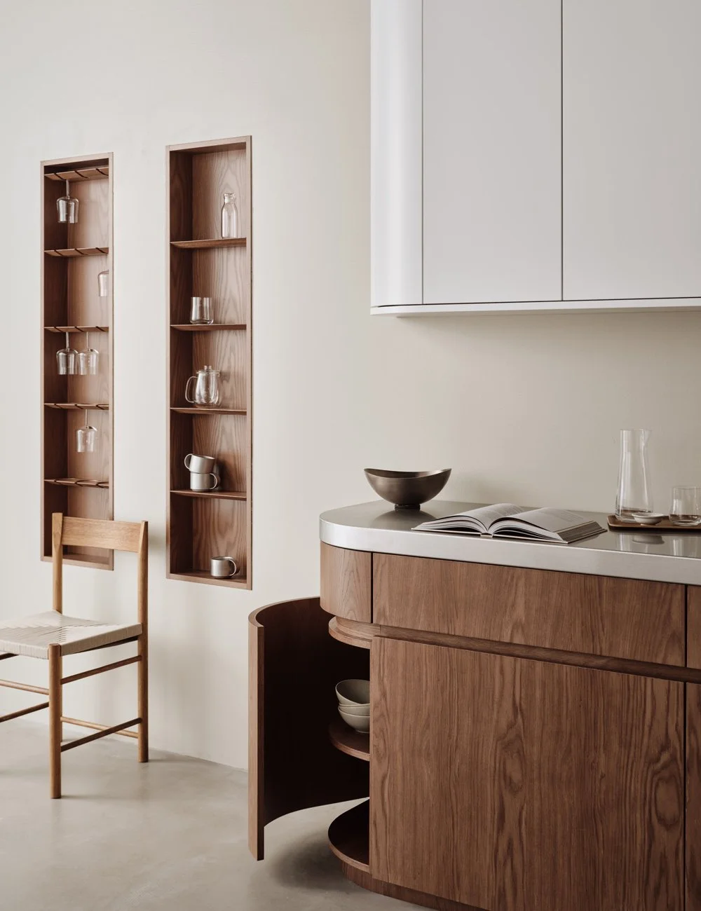 With its soft curves, the rounded cabinet provides smart, seamless storage and a smooth, flowing design whether open or closed. Read our tips on how to decorate the minimalist kitchen.