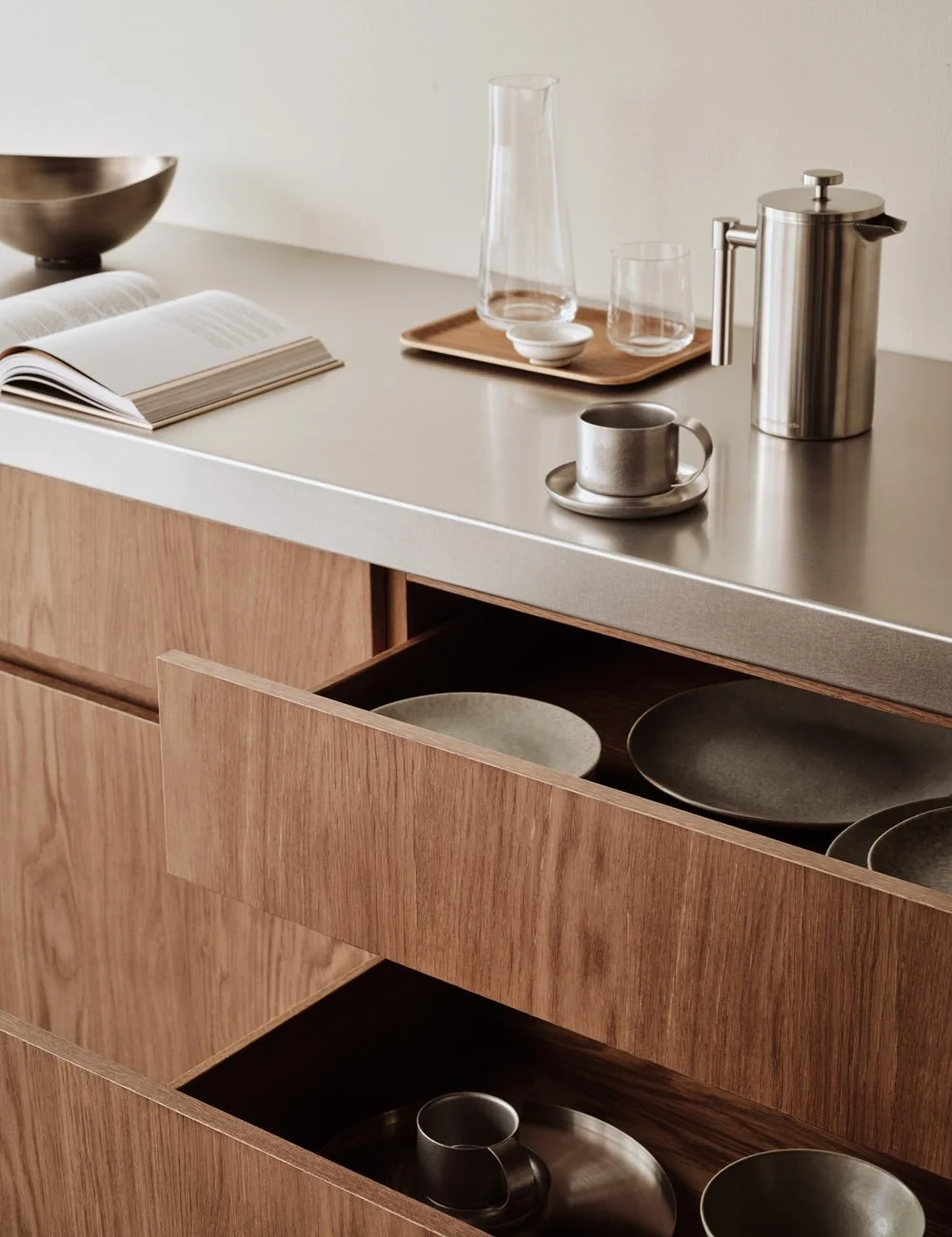 The antique stainless steel countertop pairs beautifully with the warm dark oak and rounded corners, contributing to a minimalist aesthetic in the kitchen. Plate by Broste Copenhagen and tea mug in metal by Service Projects.