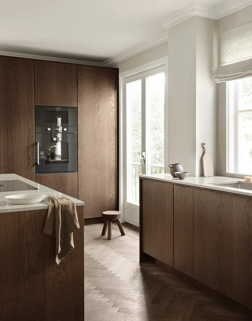 The dark oak kitchen is built entirely to fit into the beautiful architecture of the villa outside of Stockholm.